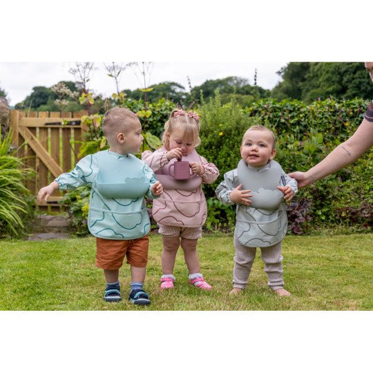 - Deux protections complémentaires : un bavoir en silicone avec poche récupératrice + un bavoir tablier manches longues pour couvrir les bras et le torse.