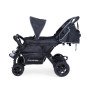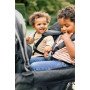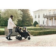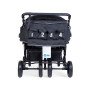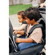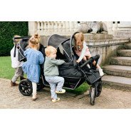 Chaque siège est équipé d’un harnais 5 points, avec dossiers réglables individuellement, pour que chaque enfant puisse trouver sa position préférée (même en mode sieste). Les deux capotes amovibles protègent efficacement du soleil ou des intempéries, et les bandes réfléchissantes augmentent la visibilité lors des sorties à la tombée du jour.