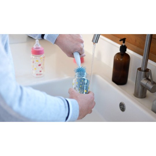 Trop facile ! Brosse ronde permettant de nettoyer facilement les biberons de toute forme Poils en silicone doux et souples évitant les rayures Embout souple et texturé pour nettoyer les tétines et les petits accessoires Manche large pour une meilleure préhension Trou d’accroche Entretien : lavage à la main ou lave-vaisselle