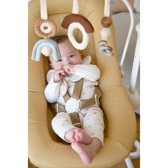 - Jeux sonores et détachables : grelots, matière craquante